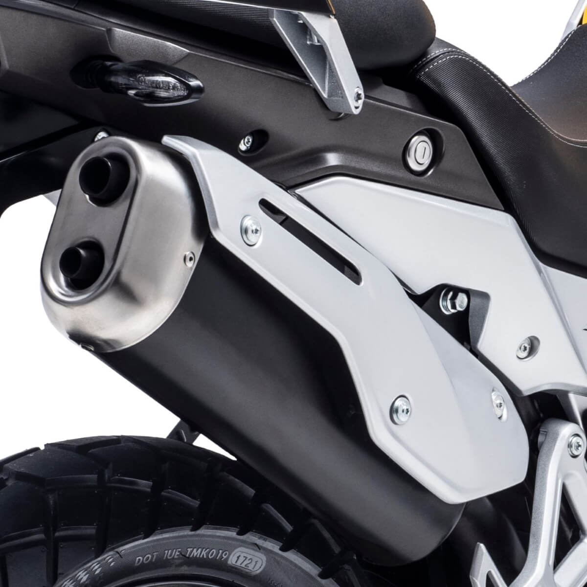 Глушитель из нержавеющей стали с увеличенным объёмом делает звуковые волны мягче и не мешает передвижению по дикой местности.