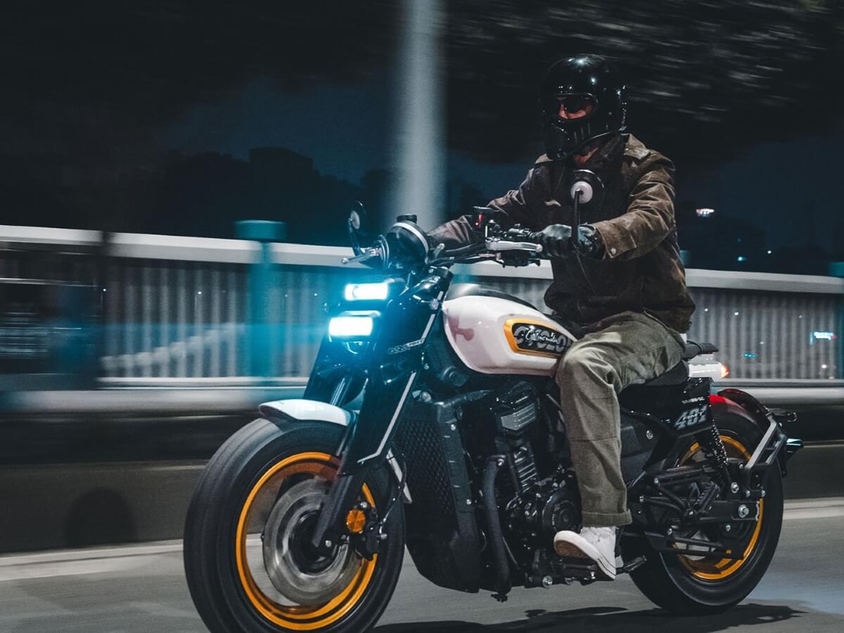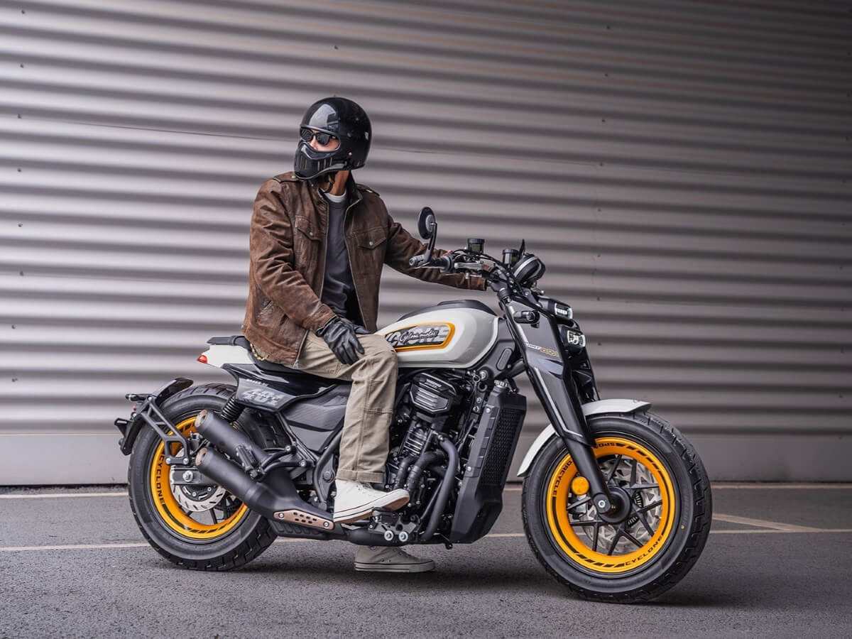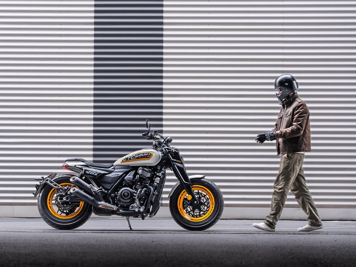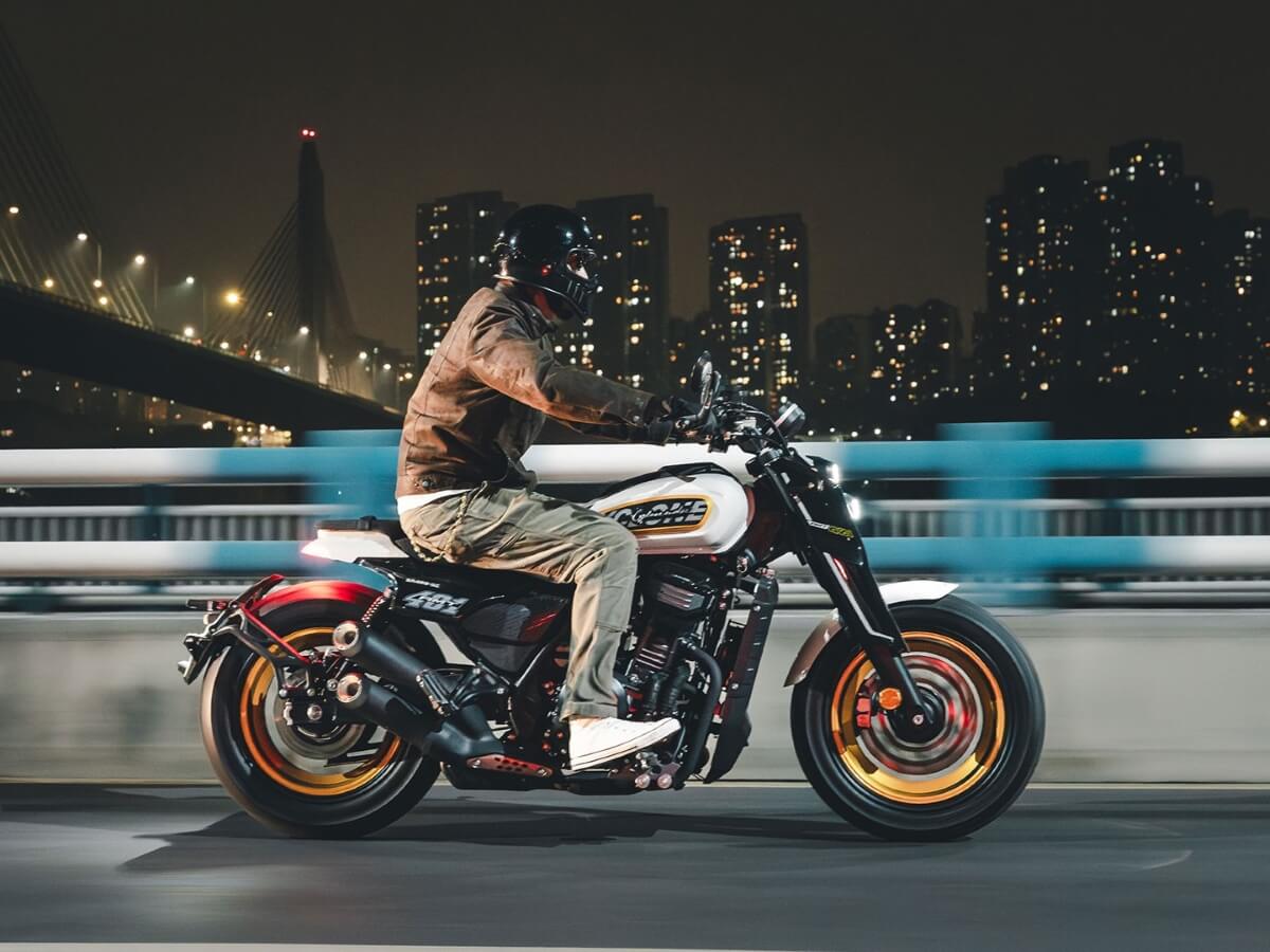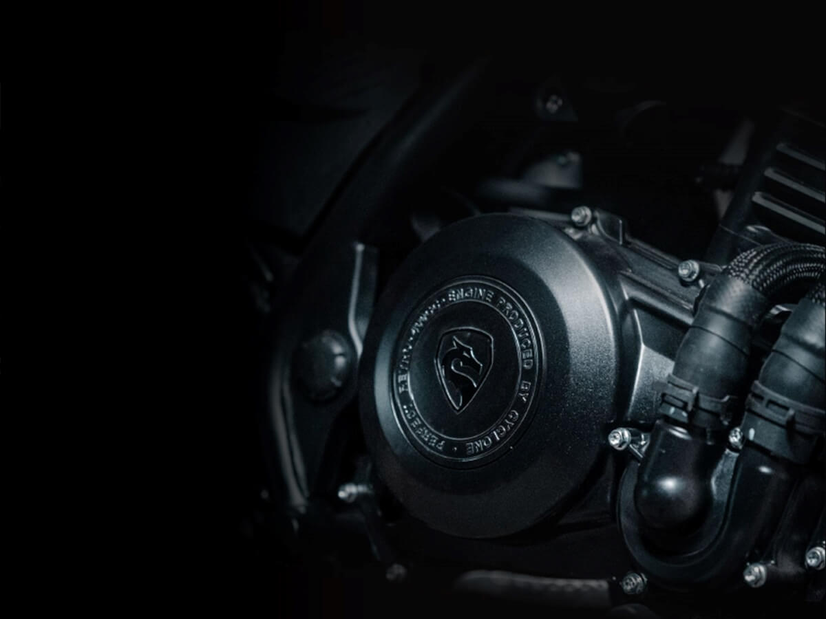 Брутальный силуэт создают массивные колёса, округлый топливный бак, двойная труба выхлопа и круглые зеркала в ретро-стилистике. А индустриальный характер проявляется с помощью чёрного матового двигателя с радиатором и двойной прямоугольной фары с горизонтальными полосами светодиодов.