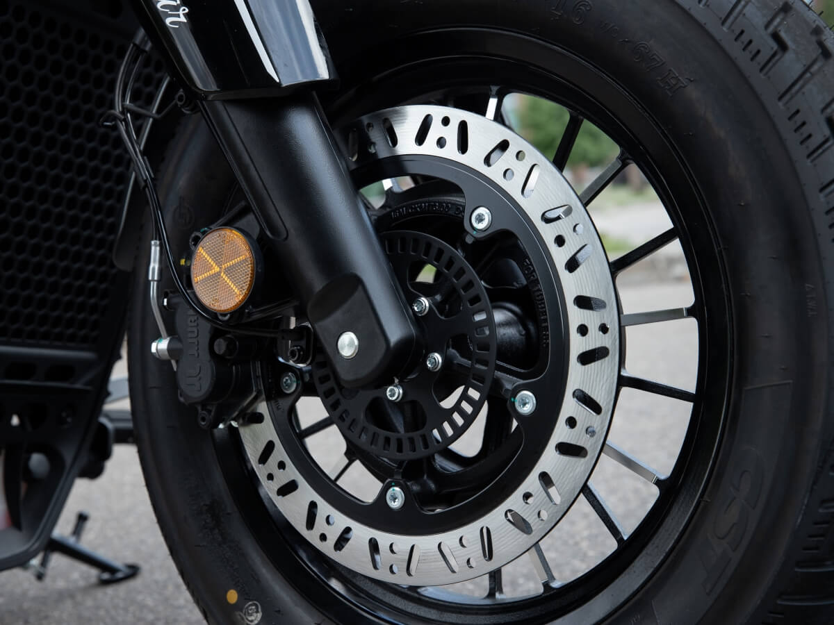 Отличное сцепление с дорогой и высокую устойчивость обеспечивают 16-дюймовые колёса с легкосплавными дисками и бескамерными покрышками. За отрабатывание всех неровностей дороги отвечает регулируемая подвеска, представленная телескопической вилкой спереди и задним маятником с моноамортизатором. Датчик давления в шинах выводит актуальные показатели на приборную панель, а клиренс в 150 мм позволяет проходить любые препятствия на вашем пути.