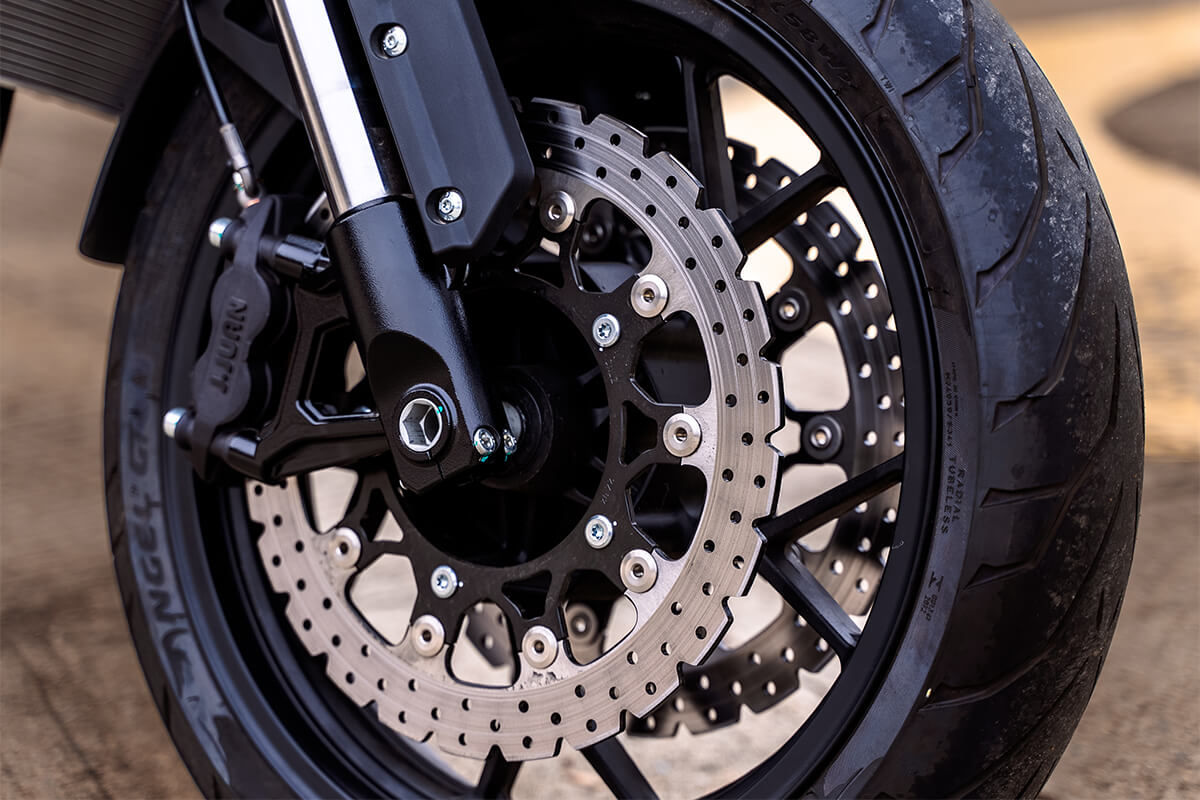 Мотоцикл оснащён литыми алюминиевыми дисками диаметром 17 дюймов. Колёса обуты в бескамерные покрышки от легендарной фирмы PIRELLI. С неровностями дороги эффективно справляются компоненты производства культовой японской компании KYB – телескопическая вилка перевёрнутого типа спереди и маятник с моноамортизатором сзади. Ход передней подвески составляет 130 мм, задней – 51 мм. Оба компонента подвески являются регулируемыми. Эффективное и безопасное замедление с любых скоростей обеспечивают гидравлические дисковые тормоза с двухканальной системой ABS спереди и сзади. Тормозные системы произведены известной испанской фирмой J.JUAN (входящей в легендарный холдинг BREMBO).
