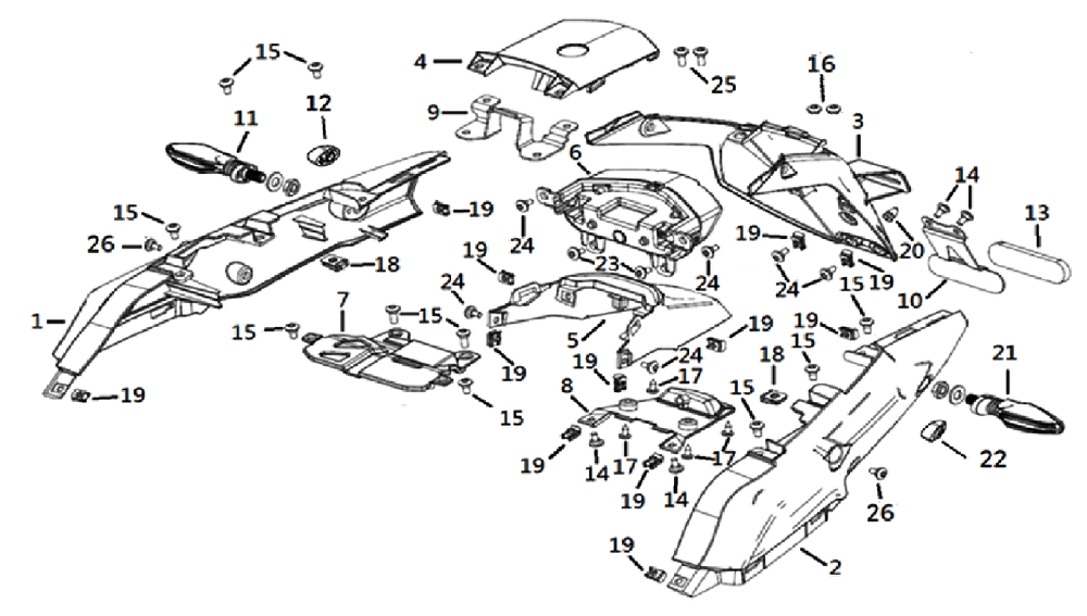 Главная Схемы запчастей Мотоцикл CYCLONE RX401 (SR400GY-2E) Задний фонарь, пластик задний